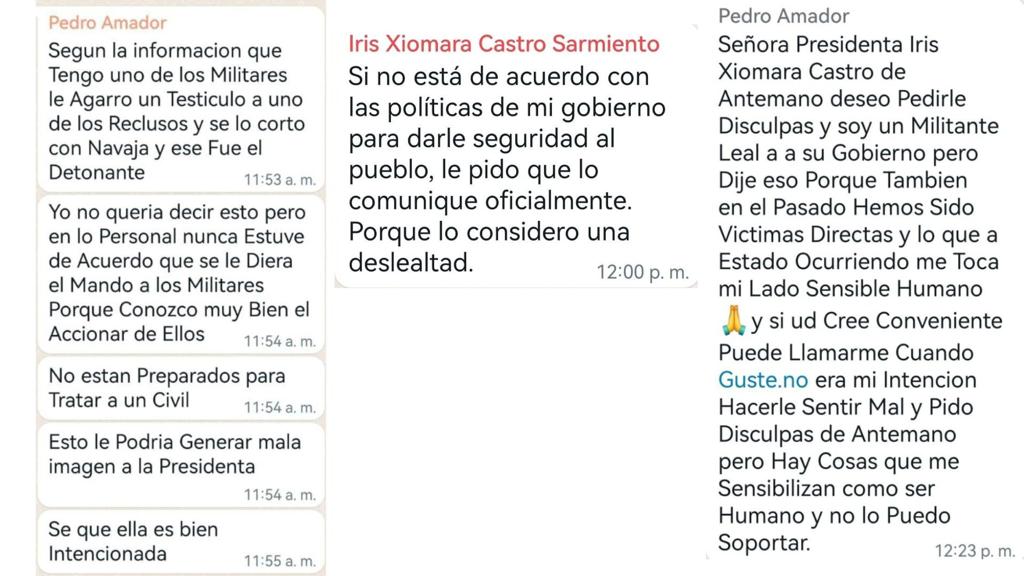 En las publicaciones se puede observar tres capturas de pantalla de conversaciones entre la presidenta y Pedro Amador, quien aseguró haber recibido informes de duros tratos de los militares a los privados de libertad.