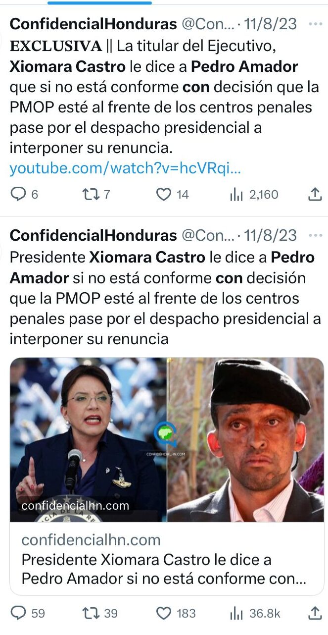En redes sociales se viralizó una supuesta conversación en la que la presidenta de Honduras, Xiomara Castro, tachó de desleal a Pedro Joaquín Amador, ministro asesor para el tema de presos políticos.