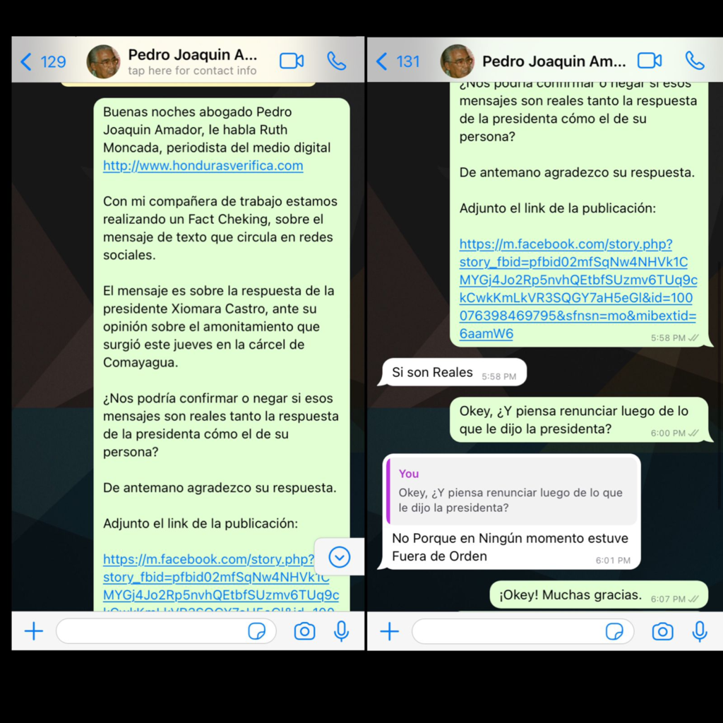 Por otro lado,con el fin de confirmar si la conversación que se viralizó en redes era real, Honduras Verifica estableció contacto por medio de WhatsApp con el ministro asesor Joaquín Amador, quien confirmó que las conversaciones filtradas son verdaderas.