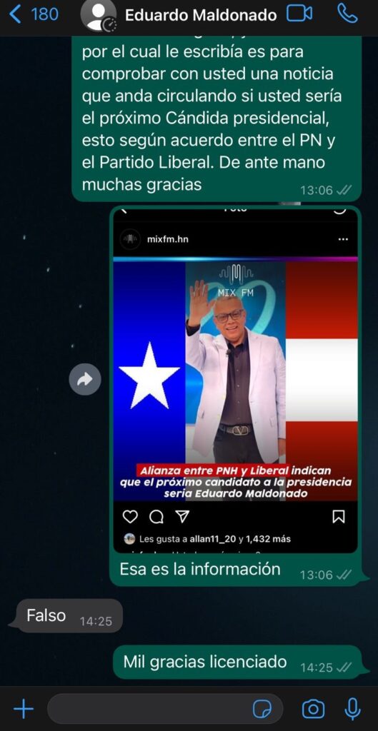 Posteriormente el equipo de Honduras Verifica se comunicó de manera directa con el licenciado Eduardo Maldonado para consultarle sobre la veracidad de esta información y mediante mensaje de whatsapp dijo que era “falso”.