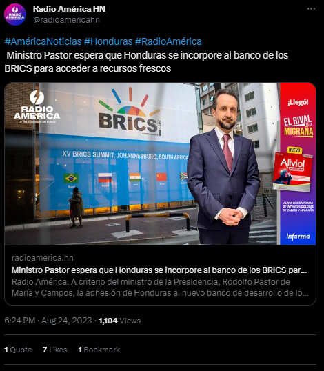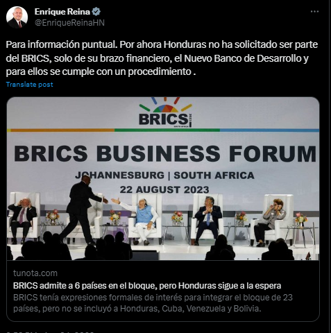 El Canciller de Honduras, Enrique Reina, publicó en sus redes sociales que no se ha solicitado la unión al bloque, pero si a su grupo financiero el NDB.