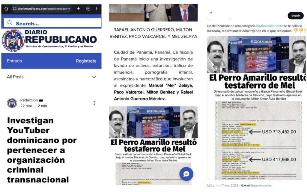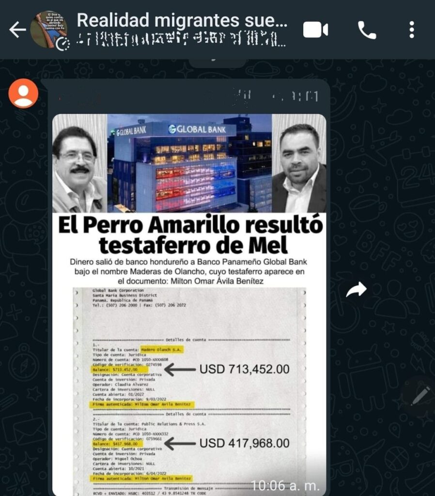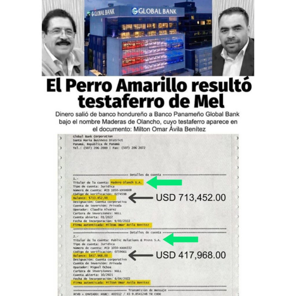 La publicación fue acompañada de una fotografía que muestra supuestas transferencias financieras desde un “banco hondureño” hacia el “Global Bank” en Panamá, bajo el nombre de “Maderas de Olancho”, sugiriendo que Benítez sería el testaferro.