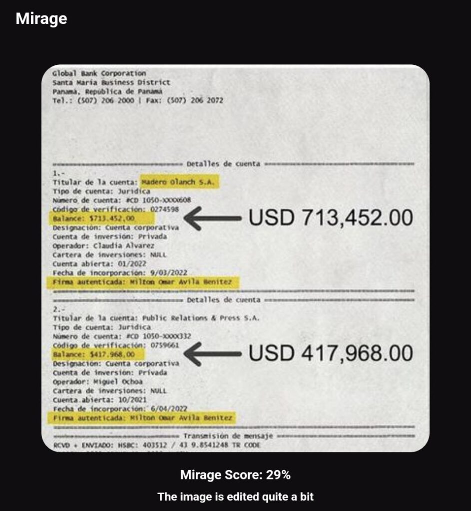 La fotografía muestra datos resaltados en color amarillo. En tal sentido, Honduras Verifica empleó la herramienta llamada Mirage, diseñada para evaluar la integridad de la imagen.