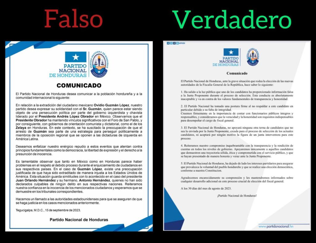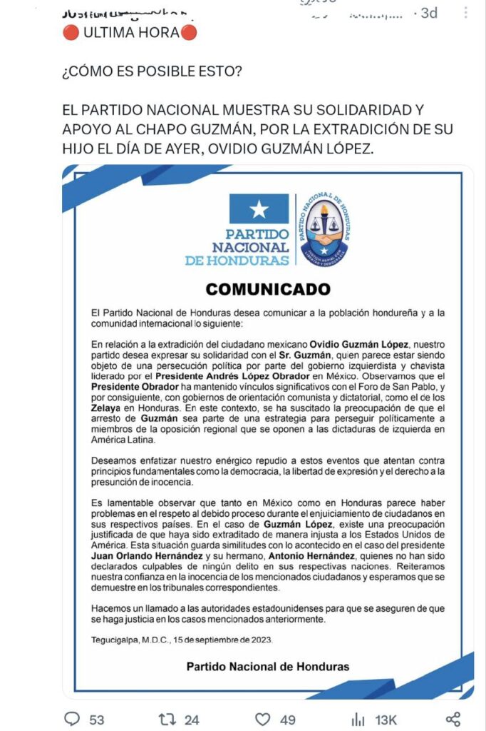 El pasado 16 de septiembre, en la plataforma X, se difundió un supuesto comunicado atribuido al Partido Nacional de Honduras (PNH), en el que la bancada expresaba su solidaridad con el narcotraficante Joaquín Guzmán Loera, conocido como el “Chapo” Guzmán, con respecto a la extradición de su hijo Ovidio Guzmán a Estados Unidos.