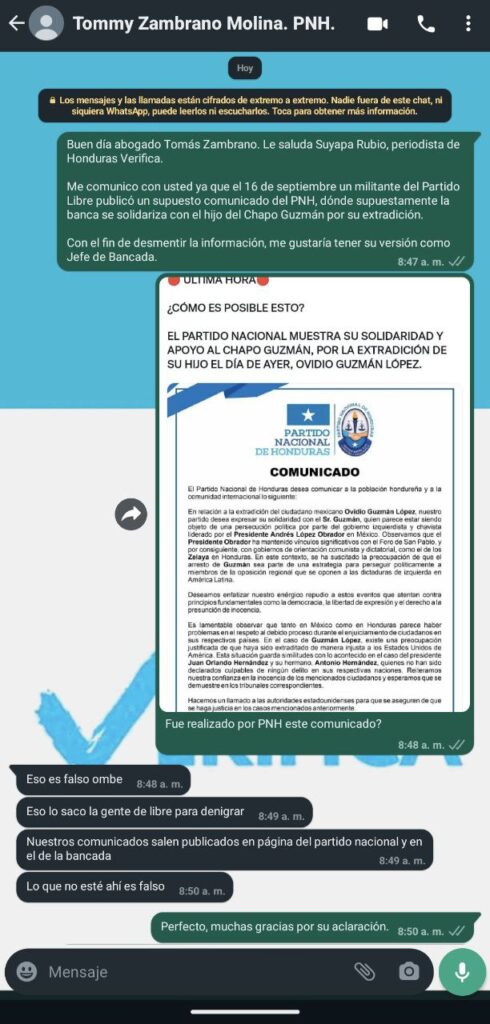 Para asegurarse de la autenticidad del comunicado, el equipo de Honduras Verifica se contactó con el jefe de Bancada del PNH, Tomás Zambrano.