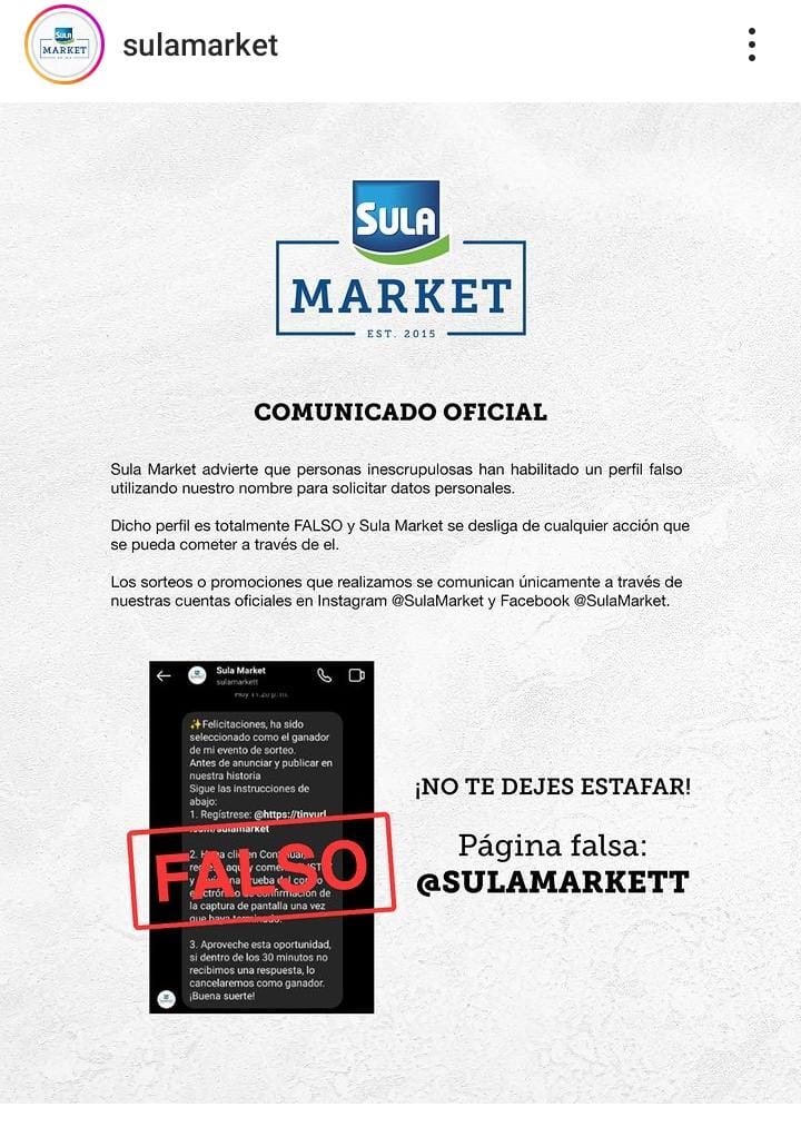 Además, en su monitoreo en las diferentes plataformas, encontró una publicación del perfil real de @SulaMarket en Instagram, donde afirma que la cuenta que envía mensajes es falsa, y le pide a la población hondureña que no se deje estafar.