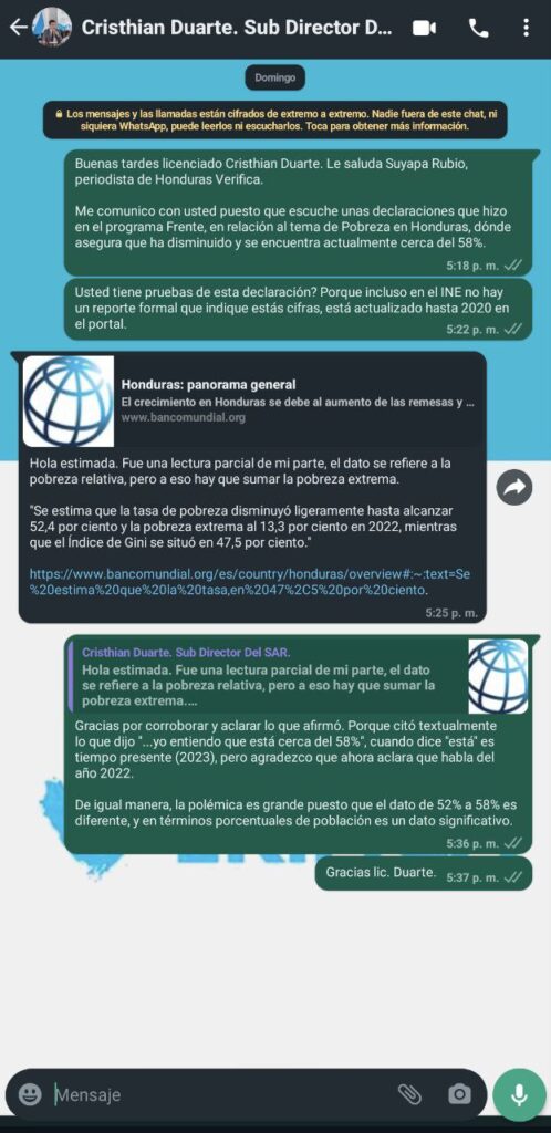 Duarte declaró que “la cantidad de pobres ha disminuido hacia el 2021, que era del 71%”, y ahora entiende que “está cerca del 58%” dando la impresión de que el gobierno actual, liderado por la presidenta Xiomara Castro, ha erradicado considerablemente la pobreza.