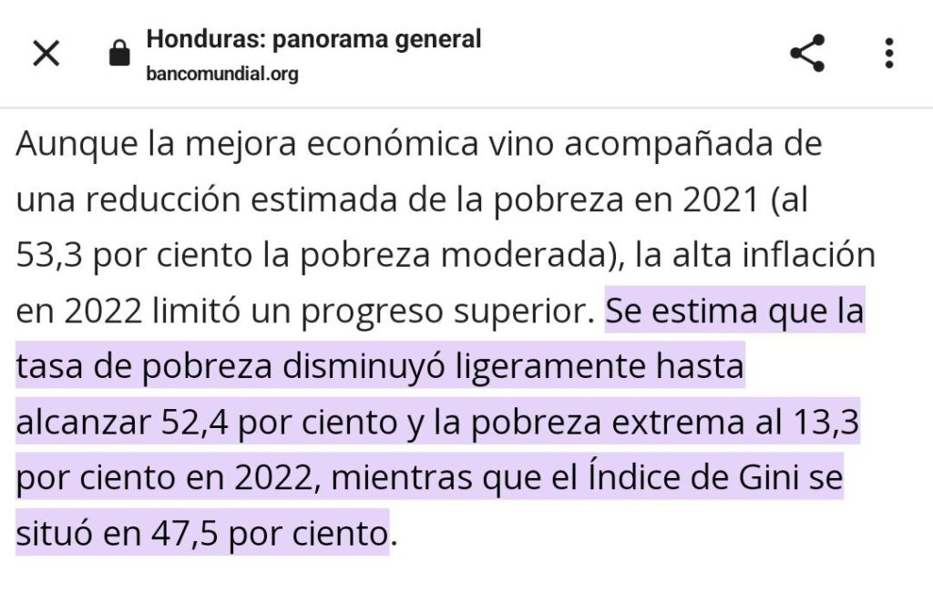 Además, citó un informe del Banco Mundial que indicaba que en Honduras “Se estima que la tasa de pobreza disminuyó ligeramente hasta alcanzar 52,4 por ciento y la pobreza extrema al 13,3 por ciento en 2022, mientras que el Índice de Gini se situó en 47,5 por ciento.”