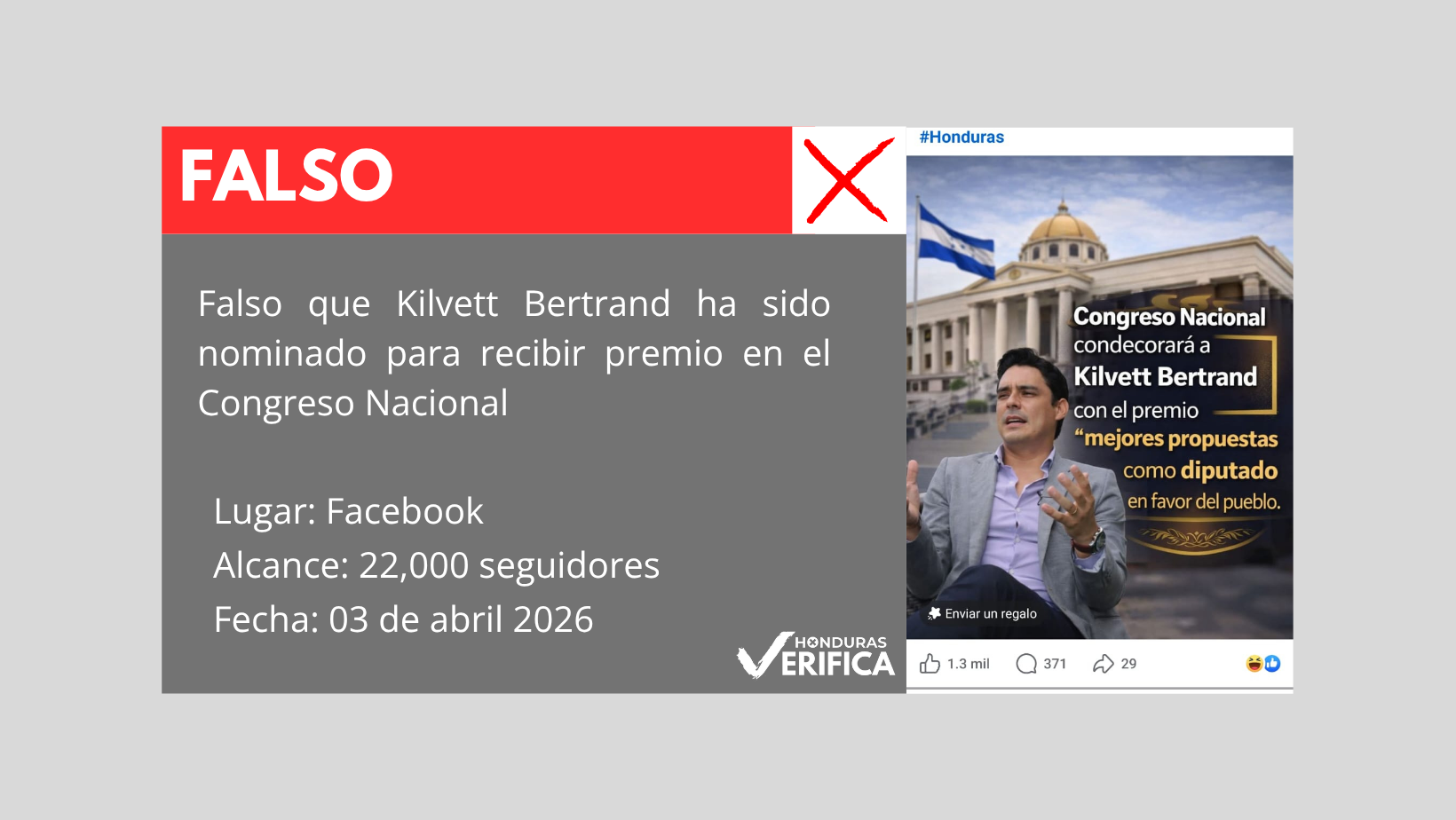 En redes sociales circula información falsa en torno al diputado del Partido Nacional, Kilvett Bertrand, porque al parecer, el Congreso Nacional lo nominó para recibir un supuesto premio por presentar “las mejores propuestas.”