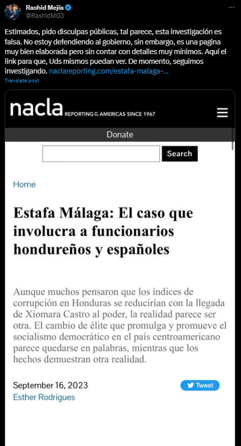 La publicación que menciona el artículo, “Estafa Málaga: El caso que involucra a funcionarios hondureños y españoles”, se encuentra en una página llamada naclareporting.com, está página web se encuentra enlazada a una página web real llamada nacla.org