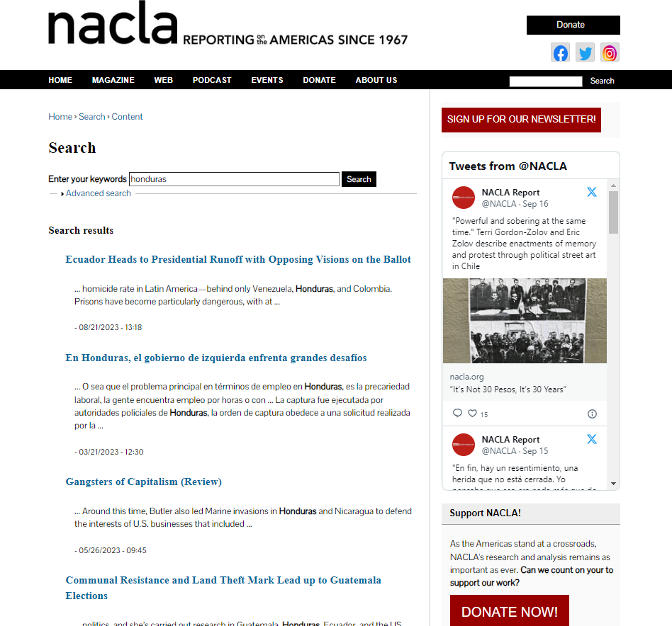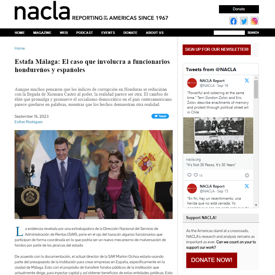 En la página web donde se encuentra el reportaje falso, todos los enlaces lo redirigen a la página oficial nacla.org, indagando en la página original cuando se buscan palabras claves como Honduras o Málaga, nos muestra una última publicación del 21 de agosto de 2023.