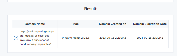 En el último análisis que se le hizo a la página web falsa es saber la creación de su dominio, en el cual encontramos que esta página fue creada el 15 de septiembre de 2023.