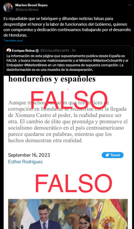 Debido a la viralidad de la publicación en redes sociales, tanto el canciller de Honduras, Enrique Reina y el Embajador de Honduras en España, Marlon Brevé; declararon esas imágenes como falsas.