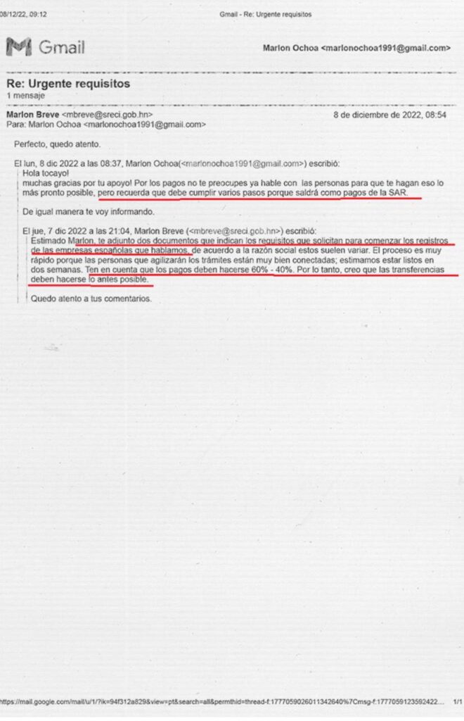 En la publicación destaca además de la esposa de Ochoa, el embajador actual de Honduras en España, Marlon Brevé, donde en dicha conversación acuerdan varios pasos para estos actos de corrupción, involucrando al SAR.