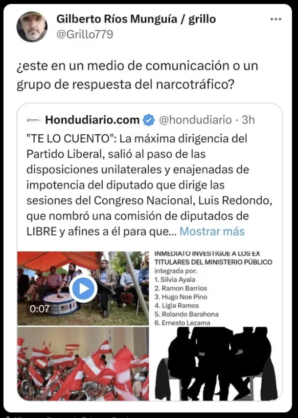 Gilberto Ríos, dirigente del Partido Libre y asesor de la presidenta Castro, atacó al medio digital Hondudiario.com diciendo que este medio es un grupo de respuesta del narcotráfico.