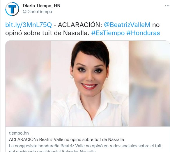 Finalmente, Diario Tiempo, a través de su cuenta oficial de Twitter publicó una nota aclaratoria, dónde especificaron que la diputada en ningún momento había opinado sobre los tuits de Nasralla  y aceptaban el error cometido por uno de sus periodistas.