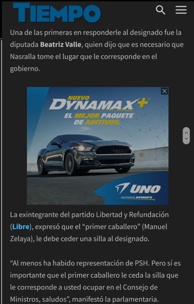Entre los comentarios el reconocido diario mencionó uno supuestamente publicado en un tweet por parte de la diputada de Libre Beatriz Valle donde expresó que el “primer caballero” (Manuel Zelaya), le debe ceder una silla al designado.