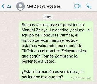 Honduras Verifica intentó comunicarse con Mel Zelaya vía WhatsApp para corroborar que dicha aseguración del diputado nacionalista fuera real, pero no hubo respuesta del expresidente.