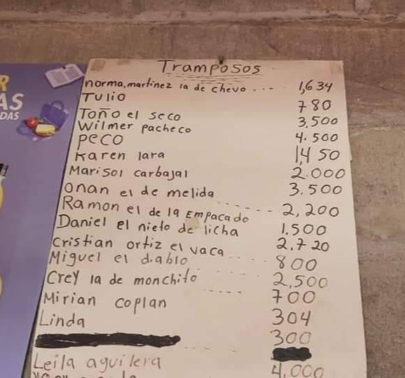 La dueña de la pulpería “Marbely”, ubicada en Santa Cruz de Yojoa, tomó la decisión de colocar afuera de su negocio una lista de los clientes que estaban “morosos”.