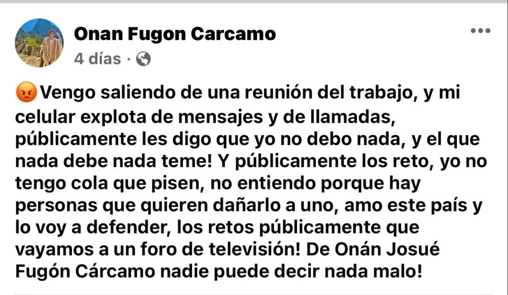 El joven Onan Fugon Cárcamo, al ver la noticia que se había publicado una lista donde aparentemente estaba su nombre, compartió la nota en su cuenta de Facebook, expresando su molestia.