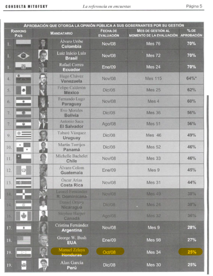 La popularidad del “comandante vaquero” se situó en uno de los peores lugares, alcanzando la penúltima posición con un 25% de aprobación de los 19 presidentes americanos que se evaluaron. No obstante, vale aclarar que este sondeo en el caso de Honduras se realizó en octubre de 2008.