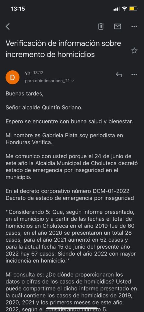 Honduras Verifica aclara que la intención de la comunicación con el Alcalde de Choluteca era para obtener el informe de los datos de la fuente de recopilación de información en torno a los homicidios y así cotejar la información de manera separada.