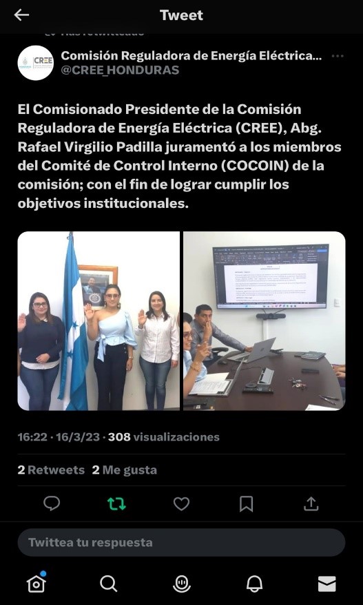 El 16 de marzo del presente año, la Comisión Reguladora de Energía Eléctrica (CREE), dio a conocer mediante su cuenta de twitter, que se había llevado a cabo la juramentación de los miembros del Comité de Control Interno (COCOIN).