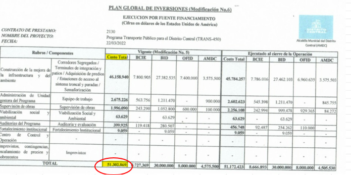 En su totalidad, los financiamientos y el capital determinado de los propios fondos de la AMDC suman una cantidad de más de 51 millones de dólares, es decir más de 1.2 billones de lempiras.