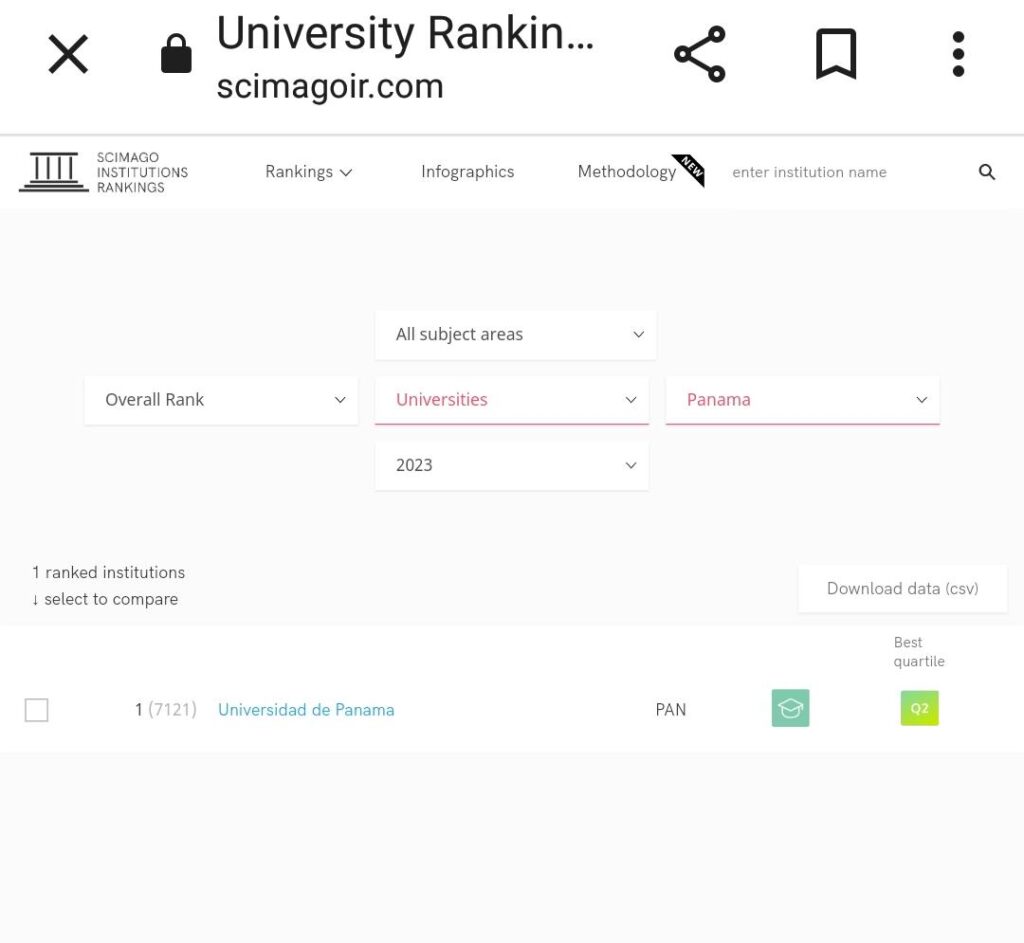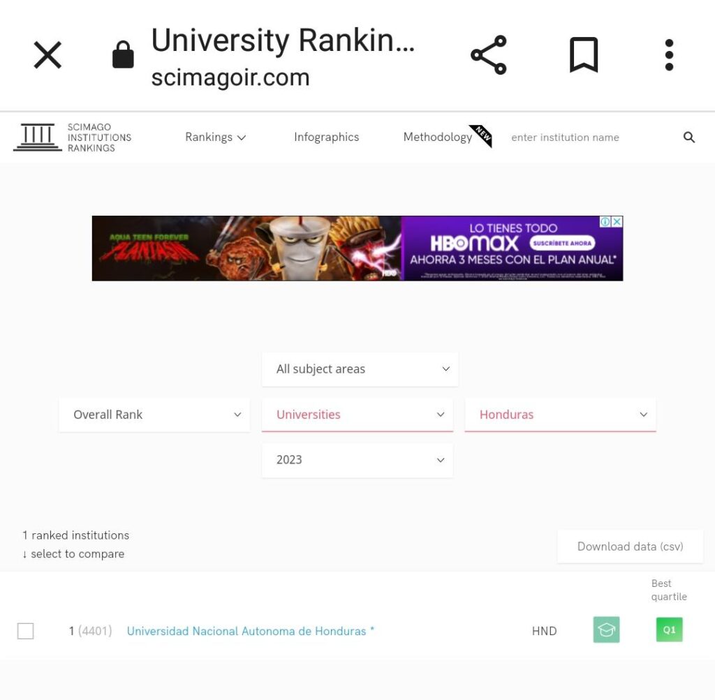 Honduras Verifica se dirigió a la página de Scimago Institutions Rankings y al ingresar el nombre del país de Honduras, constató que la UNAH es la única universidad hondureña que se encuentra en el ranking.