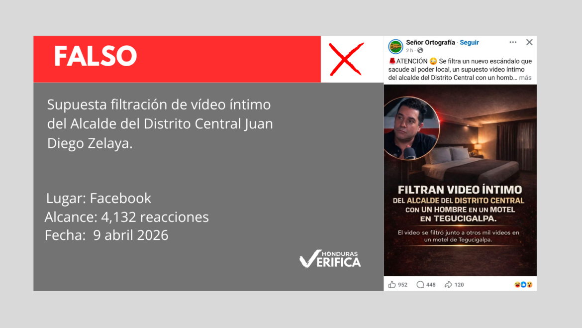 En una página de Facebook denomina “Señor ortografía” que cuenta con 22 mil seguidores, realizaron una publicación que en la imagen muestra el siguiente texto: “Filtran video íntimo del alcalde del Distrito Central con un hombre en un motel en Tegucigalpa”